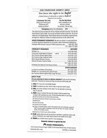 They can provide clinicians and clients with hotline numbers for local domestic violence programs. These programs include shelters in various counties, contacts at the Family Law Violence Center, Culturally sensitive assistance (e.g., Narika , a program for South Asian women and Shalom Bayit, a program for Jewish women), as well as services for women and families in rural areas.